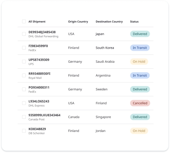View all of your shipments within a single centralized platform, where you can easily sort and filter them based on criteria such as status, destination, carrier, and additional parameters.